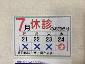7月21日(日曜日)〜7月23日(火曜日)まで休診とさせていただきます。