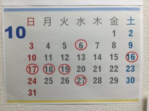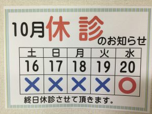 2021.09.30 / 最終更新日 : 2025.08.03 nakanishident-blog インフォメーション 10月のお休み こんにちは😃 新居浜の中西歯科矯正歯科です🦷 明日から10月ですね🎃 休診日をお知らせしておきます。 予約の変更を希望される方は、 診療日のご連絡を、お待ちしております(^_^)